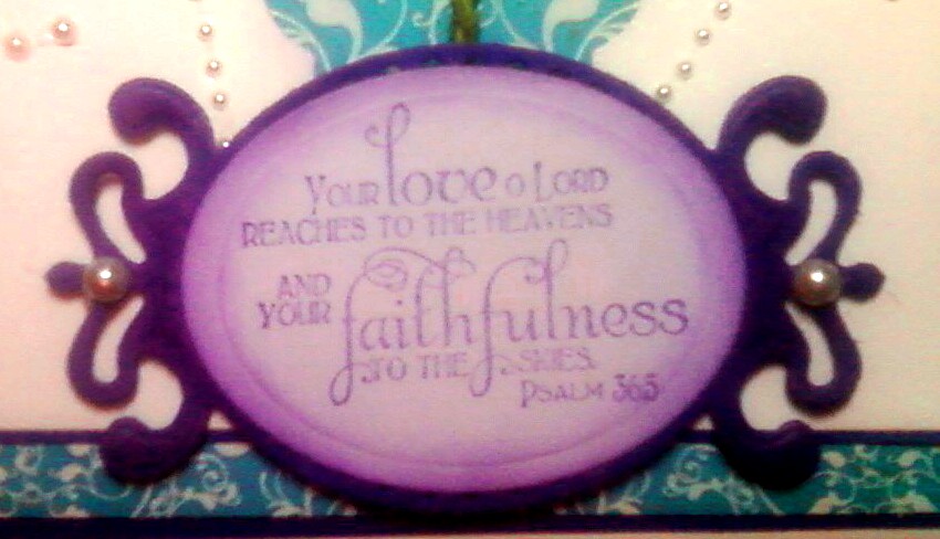Each layer has a strip, punched out with a Martha Stewart border punch, across the top to look like decorative piping. On the bottom layer I added a string of small pearls on the bottom edge. The sentiment is from JustRite’s Birthday Centers Round set and the border is from their You Inspire Me Set. I stamped the sentiment in red on white cardstock, cut it out with a Spellbinder circle die, and lightly sponged the edges with the red ink. This is popped up with foam tape on top of the border which I stamped and embossed in white on cardstock that I painted with Twinkling H2O’s. I cut it out and layered it to the right side.